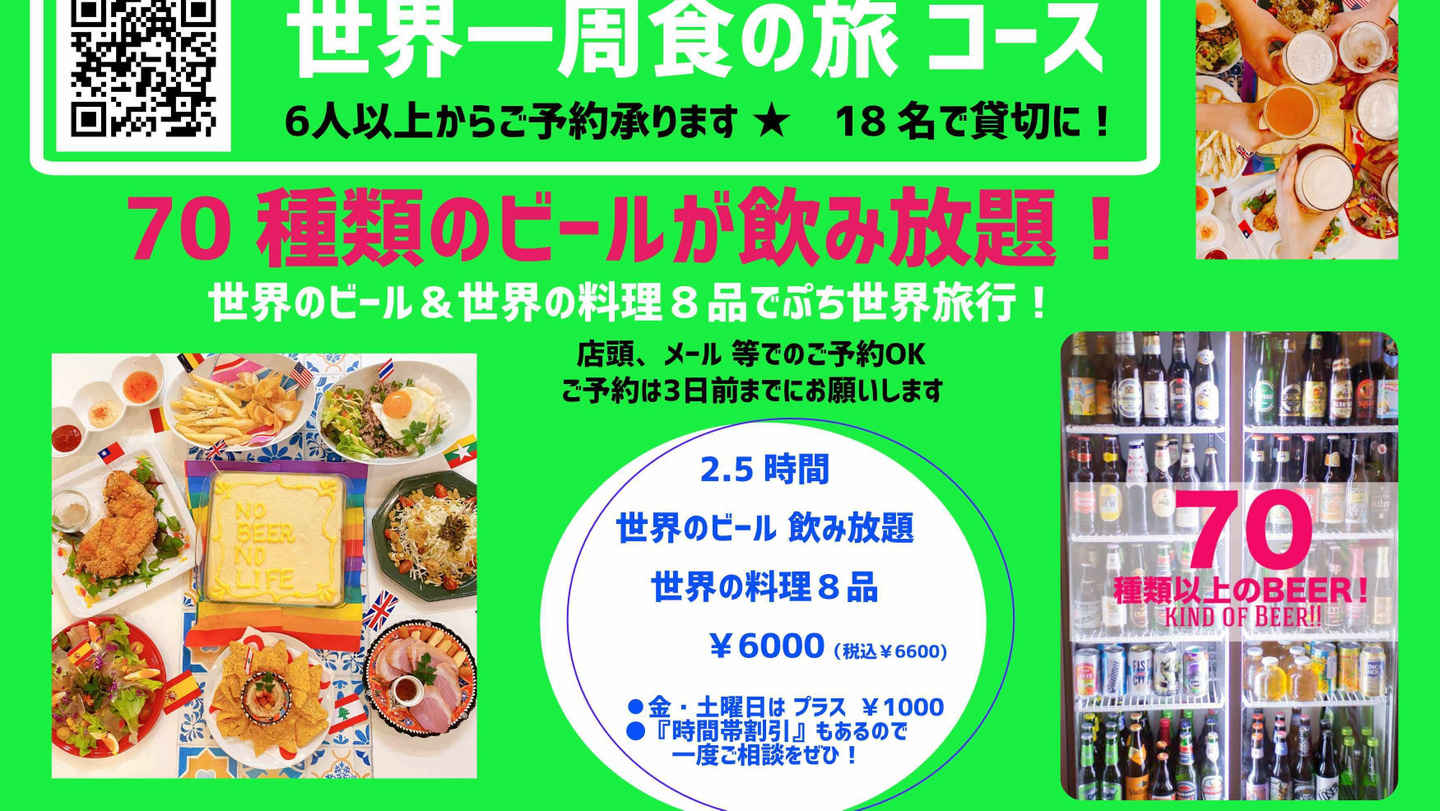 ★世界のビール 70種類のビール飲み放題 ★世界の料理しっかり8品 2.5時間コース!